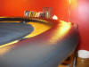 Side view of the entire table, along with another view of the race track and rail up against a wall.
